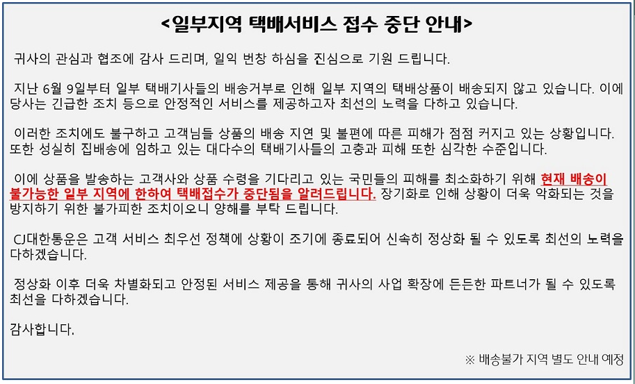 ÇöÀç ÅùèÆÄ¾÷À¸·Î ÀÎÇÏ¿© ÀϺΠÁö¿ª¿¡ ¹è¼Û Áö¿¬ÀÌ ¾È³»µÇ¾î °øÁöµå¸³´Ï´Ù.