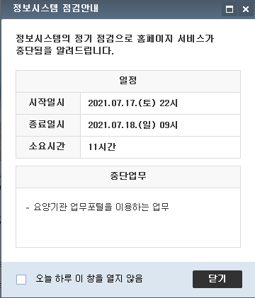 ¾È³çÇϼ¼¿ä. ´Ù¼Ø¸ÞµðÄÉ¾î °ü¸®ÀÚÀÔ´Ï´Ù. °Ç°º¸Çè½É»çÆò°¡¿ø ¿ä¾ç±â°ü¾÷¹«Æ÷ÅÐ '21.07.17(Åä) 22½Ã~07.18(ÀÏ) 09½Ã Á¤º¸½Ã½ºÅÛ Á¤±âÁ¡°Ë ¾È³»°¡ ÀÖ¾î °Ô½ÃÇÕ´Ï´Ù. °ü·Ã¾÷¹«¿¡ Âü°íÇϽñ⠹ٶø´Ï´Ù.