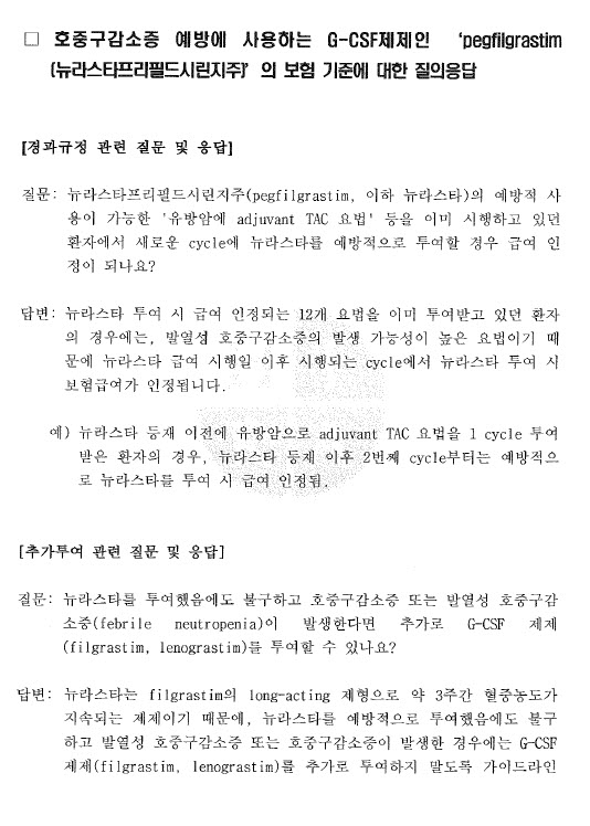 º¸°Çº¹ÁöºÎ¿¡ (º¸Çè Á¦2014-41)´º¶ó½ºÅ¸(pegfilgrasitm) º¸Çè±Þ¿©±âÁØ Àû¿ë °ü·Ã ÁúÀÇ ÀÀ´ä ¾È³»°¡ ÀÖ¾î °í½ÃÇØµå¸³´Ï´Ù.
