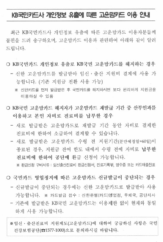 2. ±¹¹Î°Ç°º¸Çè°ø´Ü¿¡¼ Àӽš¤Ãâ»ê Áø·áºñ Áö¿øÁ¦µµ(°í¿î¸¾ Ä«µå) À§Å¹»ç¾÷ÀÚÀÎ KB±¹¹ÎÄ«µå»ç °³ÀÎÁ¤º¸ À¯Ãâ»ç°í¿Í °ü·ÃÇÏ¿© °í¿î¸¾Ä«µå ÀÌ¿ë¹æ¹ýÀ» ºÙÀÓ°ú °°ÀÌ ¾Ë·Á¿Í ¾È³»ÇÕ´Ï´Ù.