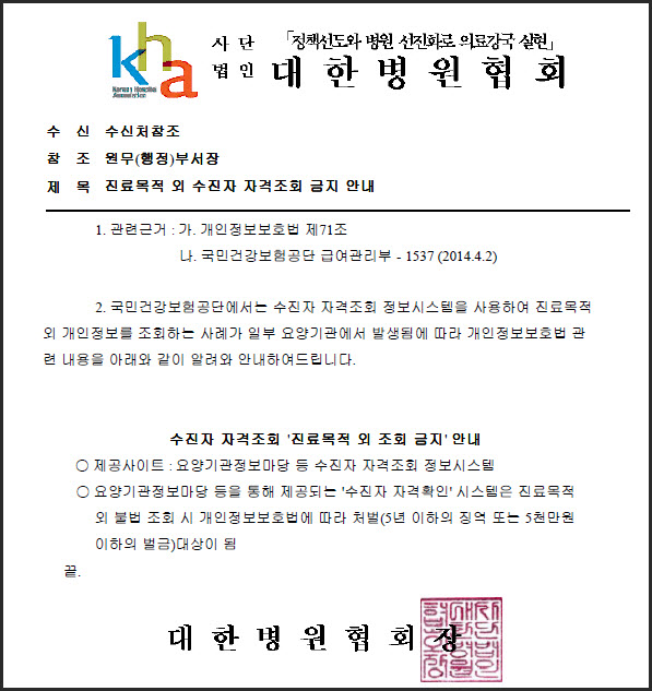2. ±¹¹Î°Ç°º¸Çè°ø´Ü¿¡¼´Â ¼öÁøÀÚ ÀÚ°ÝÁ¶È¸ Á¤º¸½Ã½ºÅÛÀ» »ç¿ëÇÏ¿© Áø·á¸ñÀû ¿Ü °³ÀÎÁ¤º¸¸¦ Á¶È¸ÇÏ´Â »ç·Ê°¡ ÀϺΠ¿ä¾ç±â°ü¿¡¼ ¹ß»ýµÊ¿¡ µû¶ó °³ÀÎÁ¤º¸º¸È£¹ý °ü·Ã ³»¿ëÀ» ¾Æ·¡¿Í °°ÀÌ ¾Ë·Á¿Í ¾È³»ÇÏ¿©µå¸³´Ï´Ù.
