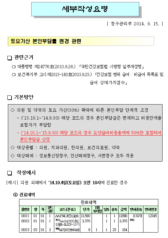 ±¹¹Î°Ç°­º¸Çè¹ý ½ÃÇà·É [º°Ç¥2] 1È£°¡¸ñ1)¿¡ ÀǰŠ2014.10.1ÀϺÎÅÍ Åä¿ä°¡»ê(¿ÀÀü9½Ã~¿ÀÈÄ1½Ã±îÁöÀÇ Áø·á 30%°¡»ê)ÀÇ º»Àκδã·üÀÌ 100ºÐÀÇ 50À¸·Î º¯°æµÊ¿¡ µû¶ó û±¸¹æ¹ýÀ» ´Ù½Ã ¾È³»ÇÏ¿À´Ï °ü·Ã ¾÷¹«¿¡ Âü°íÇϽñ⠹ٶø´Ï´Ù.