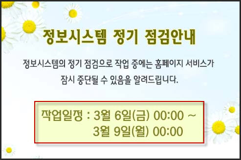 ½É»çÆò°¡¿ø ȨÆäÀÌÁö¿¡ Á¤º¸½Ã½ºÅÛ Á¤±â Á¡°Ë¾È³»°¡ ÀÖ¾î °øÀ¯ÇÕ´Ï´Ù.