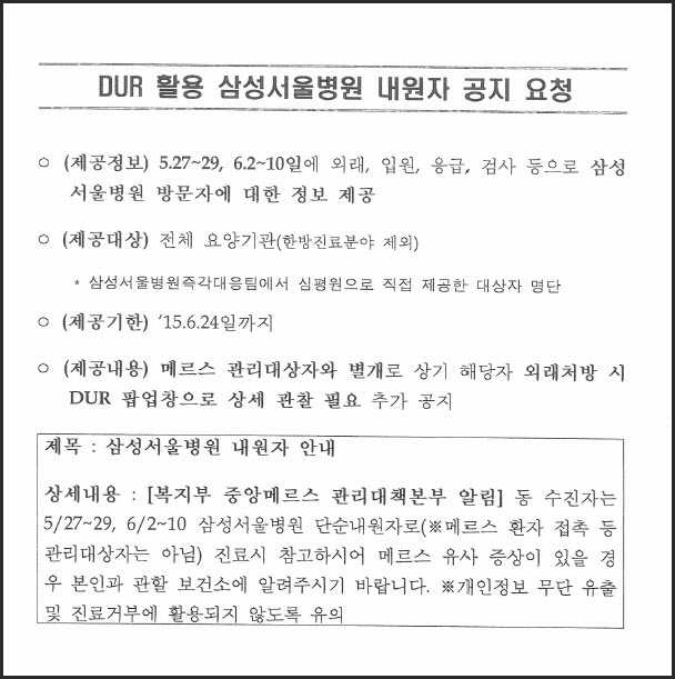 2. À§¿Í °ü·Ã, ¸Þ¸£½º(MERS) È®»ê ¹æÁö¸¦ À§ÇØ ÀÇ·á±â°üÀÇ ¿Ü·¡Áø·á½Ã DUR½Ã½ºÅÛ¿¡¼ '»ï¼º¼¿ïº´¿ø ³»¿øÀÚ'ÀÓÀ» ÀÎÁöÇÒ¼ö ÀÖµµ·Ï Á¤º¸°¡ Á¦°øµÊÀ» ¾È³»ÇÕ´Ï´Ù.