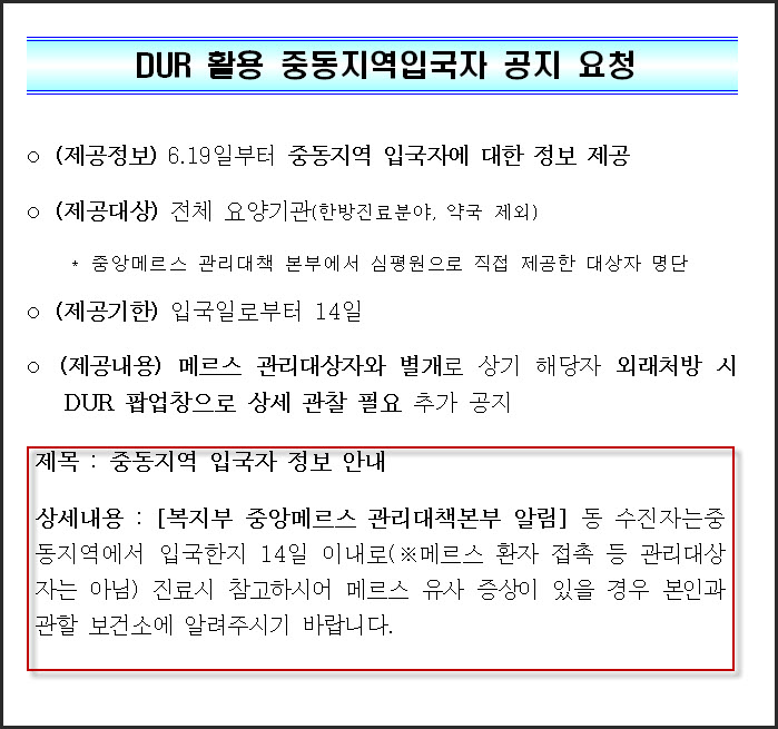 3. ¸Þ¸£½º °ü¸® °È¸¦ À§ÇÏ¿© ÀÇ·áÀÎÀÌ ¿Ü·¡È¯ÀÚ Áø·á ½Ã DUR½Ã½ºÅÛÀ» ÅëÇÏ¿© "»ï¼º¼¿ïº´¿ø ³»¿øÀÚ" ¹× "Áßµ¿Áö¿ªÀÔ±¹ÀÚ"ÀÓÀ» Á¶È¸ÇÒ ¼ö ÀÖµµ·Ï ºÙÀÓ°ú °°ÀÌ "¸Þ¸£½º´ë»óÀÚ Á¶È¸½Ã½ºÅÛ"À» ¿î¿µÇϰí ÀÖ½À´Ï´Ù.