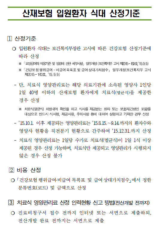 2. °Ç°º¸Çè¿¡¼ '15.10.1.ºÎÅÍ ÀÔ¿øÈ¯ÀÚ ½Ä´ë¿¡ ´ëÇÏ¿© ¼ö°¡Àλó ¹× Á÷¿µ.¼±Åð¡»ê ÆóÁö µî Á¦µµ¸¦ °³¼±ÇÏ¿© Àû¿ëÇÔ¿¡ µû¶ó ±Ù·Îº¹Áö°ø´ÜÀÇ »êÀ纸Çè ÀÔ¿øÈ¯ÀÚ ½Ä´ë »êÁ¤±âÁØÀ» ºÙÀÓ°ú °°ÀÌ ¾È³»µå¸³´Ï´Ù.