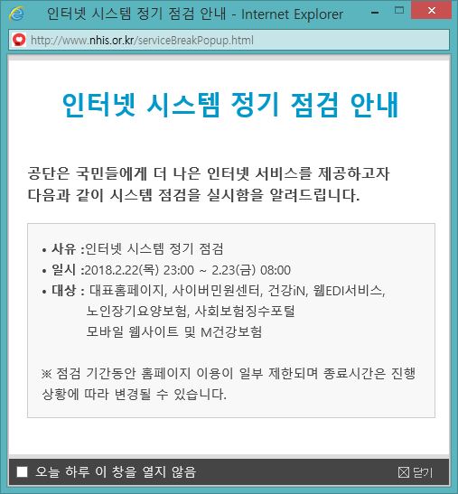 ¾È³çÇϼ¼¿ä. ´Ù¼ØÁ¤º¸ °ü¸®ÀÚÀÔ´Ï´Ù. ±¹¹Î°Ç°º¸Çè°ø´Ü ȨÆäÀÌÁö¿¡ ÀÎÅͳݽýºÅÛ Á¤±âÁ¡°Ë ¾È³»°¡ ÀÖ¾î °Ô½ÃÇÕ´Ï´Ù. °ü·Ã¾÷¹«¿¡ Âü°íÇϽñ⠹ٶø´Ï´Ù.