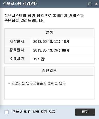¾È³çÇϼ¼¿ä. ´Ù¼Ø¸ÞµðÄÉ¾î °ü¸®ÀÚÀÔ´Ï´Ù. °Ç°º¸Çè½É»çÆò°¡¿ø ȨÆäÀÌÁö¿¡ 2019.05.18(Åä)~05.19(ÀÏ) Á¤º¸½Ã½ºÅÛ Á¡°Ë¾È³» ¾È³»°¡ ÀÖ¾î °Ô½ÃÇÕ´Ï´Ù. °ü·Ã¾÷¹«¿¡ Âü°íÇϽñ⠹ٶø´Ï´Ù.