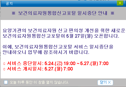¾È³çÇϼ¼¿ä. ´Ù¼Ø¸ÞµðÄÉ¾î °ü¸®ÀÚÀÔ´Ï´Ù. °Ç°º¸Çè½É»çÆò°¡¿ø º¸°ÇÀÇ·áÀÚ¿øÅëÇսŰíÆ÷Åп¡ 2019.05.24(±Ý)~05.27(¿ù) º¸°ÇÀÇ·áÀÚ¿øÅëÇսŰíÆ÷ÅÐ ÀϽÃÁß´Ü ¾È³»°¡ ÀÖ¾î °Ô½ÃÇÕ´Ï´Ù. °ü·Ã¾÷¹«¿¡ Âü°íÇϽñ⠹ٶø´Ï´Ù.