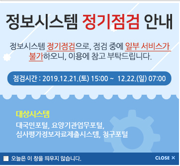 ¾È³çÇϼ¼¿ä. ´Ù¼Ø¸ÞµðÄÉ¾î °ü¸®ÀÚÀÔ´Ï´Ù. °Ç°º¸Çè½É»çÆò°¡¿ø ȨÆäÀÌÁö¿¡ 2019.12.21(Åä)~22(ÀÏ) Á¤º¸½Ã½ºÅÛ Á¤±âÁ¡°Ë ¾È³»°¡ ÀÖ¾î °Ô½ÃÇÕ´Ï´Ù. °ü·Ã¾÷¹«¿¡ Âü°íÇϽñ⠹ٶø´Ï´Ù.