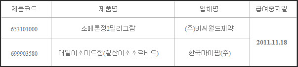 2. À§¿Í °ü·Ã, °æÀÎÁö¹æ½ÄǰÀǾàǰ¾ÈÀüû¿¡¼­ (ÁÖ)Á¦À̾ËÇÇ µî 4°³ ¾÷ü¿¡ ´ëÇØ 2011³â ÀǾàǰ ÀçÆò°¡(»ýµ¿¼º ½ÃÇè°èȹ¼­) ¹ÌÁ¦Ãâ(3Â÷)À» »çÀ¯·Î ÇØ´çǰ¸ñ(8ǰ¸ñ)À» '11.11.18ÀÏÀÚ·Î Çã°¡(½Å°í) Ãë¼ÒÇÏ¿´À½À» ¾Ë·Á¿Ô½À´Ï´Ù. ÀÌ¿¡ , ÇöÀç ±Þ¿©ÁßÀÎ ¾Æ·¡ 2ǰ¸ñ¿¡ ´ëÇØ ¾à°¡È­ÀÏ¿¡ 2011.11.18ÀÏÀÚ·Î ±Þ¿©ÁßÁö Á¶Ä¡ÇÔÀ» ¾Ë·Áµå¸®´Ï °ü·Ã ¾÷¹«¿¡ Âü°íÇϽñ⠹ٶø´Ï´Ù.