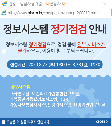 ¾È³çÇϼ¼¿ä. ´Ù¼Ø¸ÞµðÄÉ¾î °ü¸®ÀÚÀÔ´Ï´Ù. °Ç°º¸Çè½É»çÆò°¡¿ø ȨÆäÀÌÁö¿¡ '20.08.22(Åä) 19:00~ 08.23(ÀÏ) 07:30 Á¤º¸½Ã½ºÅÛ Á¤±âÁ¡°Ë ¾È³»°¡ ÀÖ¾î °Ô½ÃÇÕ´Ï´Ù. °ü·Ã¾÷¹«¿¡ Âü°íÇϽñ⠹ٶø´Ï´Ù.
