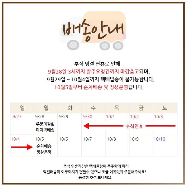 10¿ù 5ÀÏ(¿ù) ºÎÅÍ ¼øÂ÷¹è¼Û ¹× Á¤»ó¿î¿µµË´Ï´Ù.