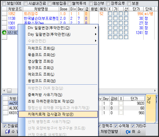1. ÇØ´ç¾àÁ¦ÄÚµåÀÇ Ã³¹æÄڵ带 ¼±ÅÃÇÑ µÚ, ¸¶¿ì½º¿À¸¥ÂÊÀ» Ŭ¸¯ÇÏ¿© Ä¡¸ÅÄ¡·áÁ¦ °Ë»ç°á°ú ÀÛ¼ºÀ» ¼±ÅÃÇÕ´Ï´Ù.