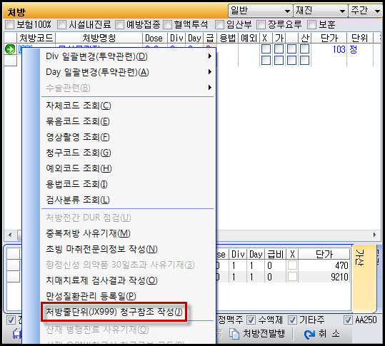 1. ÇØ´ç¾àÁ¦ÄÚµåÀÇ Ã³¹æÄڵ带 ¼±ÅÃÇѵÚ, ¸¶¿ì½º ¿À¸¥ÂÊÀ» Ŭ¸¯ÇÏ¿©, ó¹æÁÙ´ÜÀ§(JX999) û±¸ÂüÁ¶ ÀÛ¼ºÀ» ¼±ÅÃÇÕ´Ï´Ù.
