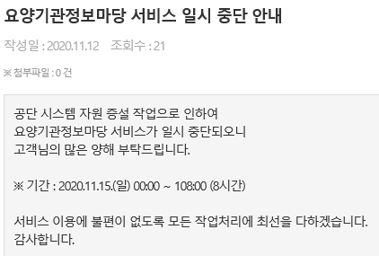 ¾È³çÇϼ¼¿ä. ´Ù¼Ø¸ÞµðÄÉ¾î °ü¸®ÀÚÀÔ´Ï´Ù. ±¹¹Î°Ç°º¸Çè°ø´Ü ȨÆäÀÌÁö¿¡ '20.11.15(ÀÏ) 00:00~08:00 ¿ä¾ç±â°üÁ¤º¸¸¶´ç ¼ºñ½º ÀϽà Áß´Ü ¾È³»°¡ ÀÖ¾î °Ô½ÃÇÕ´Ï´Ù. °ü·Ã¾÷¹«¿¡ Âü°íÇϽñ⠹ٶø´Ï´Ù.