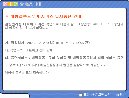 [Áúº´°ü¸®Ã»] 2020. 12. 27(ÀÏ) 04:00 ~ 09:00(5½Ã°£) ¿¹¹æÁ¢Á¾µµ¿ì¹Ì ¿¹¹æÁ¢Á¾Á¤º¸ °Ë»ö»çÀÌÆ® ¼­ºñ½º ÀϽÃÁß´Ü ¾È³»