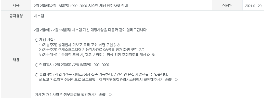 ¾È³çÇϼ¼¿ä. ´Ù¼Ø¸ÞµðÄÉ¾î °ü¸®ÀÚÀÔ´Ï´Ù. ¸¶¾à·ùÅëÇÕ°ü¸®½Ã½ºÅÛ È¨ÆäÀÌÁö¿¡ 2¿ù 2ÀÏ(È)/2¿ù 18ÀÏ(¸ñ) 19:00~20:00, ½Ã½ºÅÛ °³¼± ¿¹Á¤»çÇ× ¾È³»°¡ ÀÖ¾î °Ô½ÃÇÕ´Ï´Ù. °ü·Ã¾÷¹«¿¡ Âü°íÇϽñ⠹ٶø´Ï´Ù.