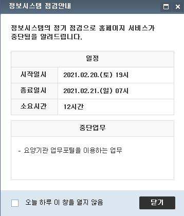¾È³çÇϼ¼¿ä. ´Ù¼Ø¸ÞµðÄÉ¾î °ü¸®ÀÚÀÔ´Ï´Ù. °Ç°º¸Çè½É»çÆò°¡¿ø ¿ä¾ç±â°ü¾÷¹«Æ÷ÅРȨÆäÀÌÁö Á¤º¸½Ã½ºÅÛ Á¡°Ë '21.02.20(Åä)~21(ÀÏ) ¾È³»°¡ ÀÖ¾î °Ô½ÃÇÕ´Ï´Ù.