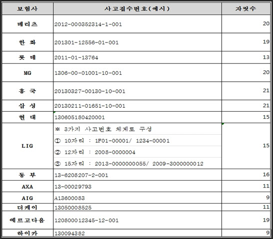 ¡£»ç°í¹øÈ£ : º¸Çèȸ»çµîÀÌ ÀÚµ¿Â÷»ç°í¿¡ ´ëÇØ¼ °¢ »ç°íº°·Î ºÎ¿©ÇÑ »ç°íÁ¢¼ö¹øÈ£ÀÔ´Ï´Ù.