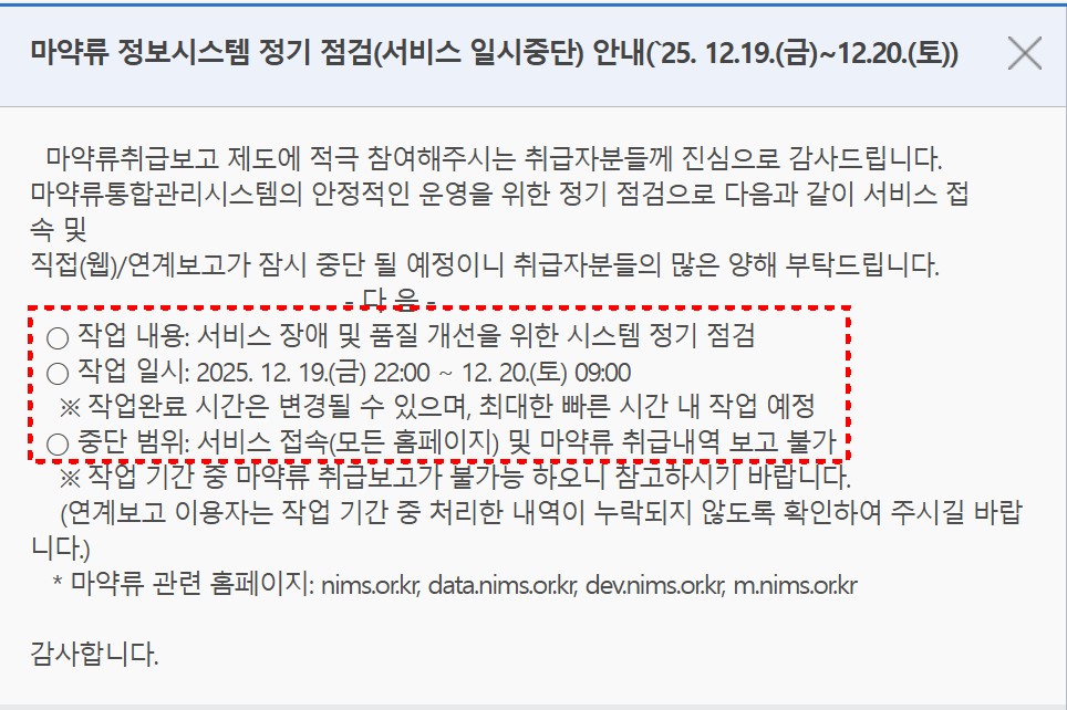 ¾È³çÇϼ¼¿ä. ´Ù¼Ø¸ÞµðÄÉ¾î °ü¸®ÀÚÀÔ´Ï´Ù. ¸¶¾à·ù ÅëÇÕ°ü¸®½Ã½ºÅÛ¿¡ ¸¶¾à·ù Á¤º¸½Ã½ºÅÛ Á¤±â Á¡°Ë(¼ºñ½º ÀϽÃÁß´Ü) ¾È³»('25.12.19(±Ý)~12.20.(Åä)) ¾È³»°¡ ÀÖ¾î °Ô½ÃÇÕ´Ï´Ù. °ü·Ã¾÷¹«¿¡ Âü°íÇϽñ⠹ٶø´Ï´Ù.