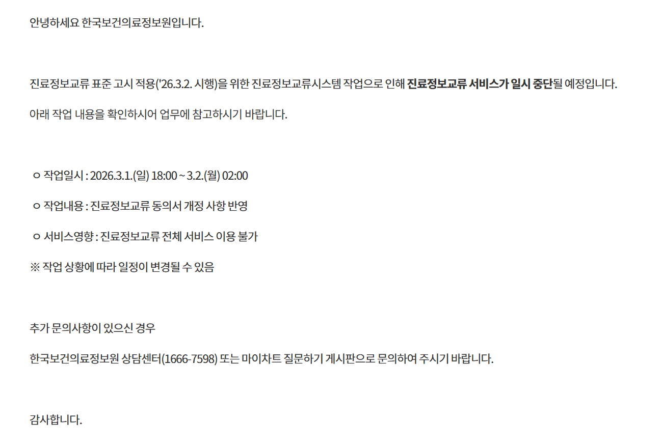 ¾È³çÇϼ¼¿ä.´Ù¼Ø¸ÞµðÄÉ¾î °ü¸®ÀÚÀÔ´Ï´Ù. º¸°Çº¹ÁöºÎ ¸¶ÀÌÂ÷Æ® °øÁö»çÇ׿¡ Áø·áÁ¤º¸±³·ù ¼ºñ½ºÀϽÃÁß´Ü ¾È³»(3.1 18:00~3.2 02:00) ¾È³»°¡ ÀÖ¾î °Ô½ÃÇÕ´Ï´Ù. °ü·Ã¾÷¹«¿¡ Âü°íÇϽñ⠹ٶø´Ï´Ù.