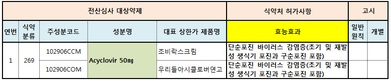 ¡Û ¿ì¸®¿øÀº Acyclovir Å©¸²Á¦, ¿¬°íÁ¦ÀÇ ½Ä¾àó Çã°¡»çÇ×(È¿´ÉÈ¿°ú)¿¡ ´ëÇØ 2013³â 11¿ù Á¢¼öºÐºÎÅÍ Àü»ê½É»ç¸¦ Àû¿ëÇÒ ¿¹Á¤ÀÔ´Ï´Ù.