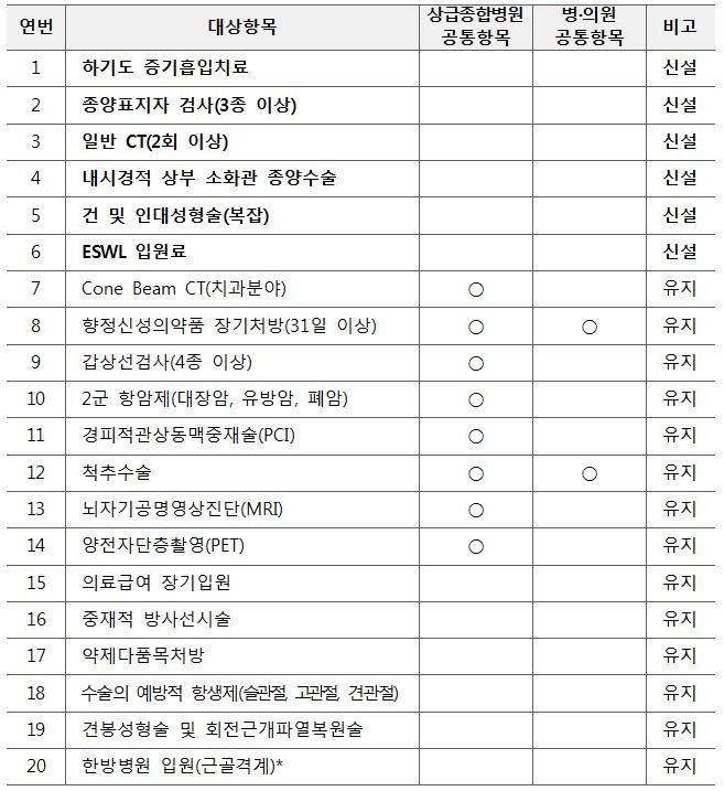 Áö³ÇØ Á¾ÇÕº´¿ø ¼±º°ÁýÁß½É»ç ¿î¿µÇ׸ñ Áß 14°³´Â ¿ÃÇØ¿¡µµ À¯ÁöµÆÀ¸¸ç, 2017³â ½Å±Ô ¿î¿µÇ׸ñÀ¸·Î Çϱ⵵ Áõ±âÈíÀÔÄ¡·á, Á¾¾çÇ¥ÁöÀÚ °Ë»ç(3Á¾ ÀÌ»ó), ÀÏ¹Ý CT(2ȸ ÀÌ»ó), ³»½Ã°æÀû »óºÎ ¼ÒȰü Á¾¾ç¼ö¼ú, °Ç ¹× ÀÎ´ë ¼ºÇü¼ú, ESWL ÀÔ¿ø·á µî 6°³ Ç׸ñÀÌ Ãß°¡µÆ´Ù.