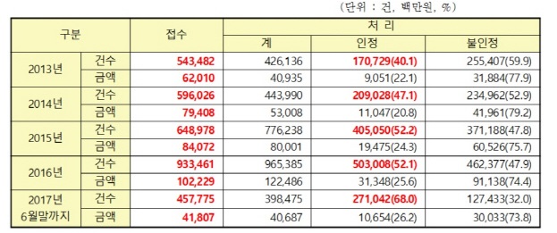 ¿ÃÇØ(1¿ùºÎÅÍ 6¿ù±îÁö)´Â 2016³âº¸´Ù ¹«·Á 15%p ÀÌ»ó ³ô¾ÆÁ® ÀÌÀǽÅû 10°Ç Áß ¾à 7°Ç(68%)ÀÌ ÀÎÁ¤µÆ´Ù. °°Àº ±â°£ ÀÌÀǽÅûÀÌ ÀÎÁ¤µÈ ±Ý¾×µµ 2013³â 90¾ï 5100¸¸¿ø¿¡¼ 2016³â 313¾ï 4800¸¸¿øÀ¸·Î ¹«·Á 3¹è ÀÌ»ó ´Ã¾ú´Ù.