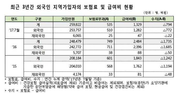 24ÀÏ ±¹È¸ º¸°Çº¹ÁöÀ§¿øÈ¸ ÃÖµµÀÚ ÀÇ¿ø(±¹¹ÎÀÇ´ç)ÀÌ °Ç°º¸Çè°ø´ÜÀ¸·ÎºÎÅÍ Á¦Ãâ¹ÞÀº ÀÚ·á¿¡ µû¸£¸é, ÃÖ±Ù 3³â°£ °Ç°º¸ÇèÀ» ÃëµæÇÑ µÚ Áø·á¸¸ ¹Þ°í Ãâ±¹ÇØ¹ö¸®´Â ¿Ü±¹ÀÎ Ãâ±¹ÀÚ´Â 2¸¸ 4,773¸íÀÎ °ÍÀ¸·Î µå·¯³µ´Ù. À̵éÀÇ Áø·á¸¦ À§ÇØ °ø´Ü¿¡¼ ºÎ´ãÇÑ ±Ý¾×¸¸ 169¾ï ¿ø¿¡ À̸¥´Ù.