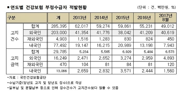 ´õºÒ¾î¹ÎÁÖ´ç ±Ç¹ÌÇõ ÀÇ¿øÀÌ °Çº¸°ø´ÜÀ¸·ÎºÎÅÍ Á¦Ãâ¹ÞÀº ÀÚ·á¿¡ µû¸£¸é 2013³âºÎÅÍ 2017³â 8¿ù±îÁö ¿Ü±¹ÀÎÀÇ °Ç°º¸Çè ºÎÁ¤¼ö±Þ °Ç¼ö´Â 20¸¸3,000°ÇÀ¸·Î °°Àº ±â°£ ³»±¹ÀÎ 7¸¸7,492°Ç¿¡ ºñÇØ 2.6¹è ¸¹Àº °ÍÀ¸·Î Áý°èµÆ´Ù.
