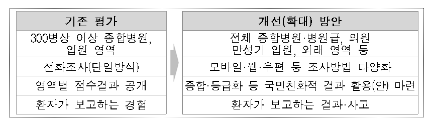 [µ¥Àϸ®¸Þµð ÇÑÇØÁø ±âÀÚ] 'ÀÇ·á¼ÒºñÀÚ °üÁ¡ÀÇ ÀÇ·á Áú Çâ»ó À¯µµ'¸¦ À§ÇÑ ¸ñÀûÀ¸·Î °Ç°º¸Çè½É»çÆò°¡¿øÀÌ µµÀÔÇÑ È¯ÀÚ°æÇèÆò°¡°¡ ±âÁ¸ 300º´»ó ÀÌ»ó Á¾ÇÕº´¿ø¿¡¼ ÀÇ¿ø±ÞÀ¸·Î È®´ëµÉ °ÍÀ¸·Î º¸ÀδÙ. ½ÉÆò¿øÀº 11ÀÏ È¯ÀÚÁ߽ɼº Æò°¡ ÁßÀå±â ¹ßÀü¹æ¾È ¿¬±¸¿ë¿ª¿¡ Âø¼öÇÑ´Ù°í ¹àÇû´Ù. ȯÀÚ°æÇèÆò°¡´Â 1ÀÏ ÀÌ»ó ÀÔ¿øÈ¯ÀÚ¸¦ ´ë»óÀ¸·Î ÀÇ·á±â°üÀÇ Á¤º¸ Á¦°øÀ̳ª ÀÇ·áÁø°úÀÇ ¼ÒÅë µî ÀǷἺñ½º ¼öÁØÀ» È®ÀÎÇÏ´Â Á¦µµ·Î 2018³âºÎÅÍ ½ÃÇàµÆ´Ù. 2018³â¿¡ ½ÃÇàµÈ 1Â÷ Æò°¡´Â 500º´»ó ÀÌ»ó Á¾ÇÕº´¿ø¿¡ ÇÑÇØ ½ÃÇàµÆÀ¸¸ç ÇöÀç ºÐ¼®ÀÌ ÁøÇà ÁßÀÎ 2019³âµµ 2Â÷ Æò°¡´Â 300º´»ó ÀÌ»ó Á¾ÇÕº´¿ø±îÁö È®´ëµÆ´Ù. ±×·¯³ª Æò°¡ ¸ðµ¨ ¼öÁ¤°ú °á°ú Ȱ¿ë¿¡ ´ëÇØ ¸¹Àº ÀǰßÀÌ Á¦½ÃµÆ´Ù. ÁÖµÈ ÁöÀûÀº ȯÀÚ°æÇèÆò°¡µµ ´Ù¸¥ Æò°¡¿Í ¸¶Âù°¡Áö·Î ȯÀÚ ¼±È£µµ°¡ ³ôÀº »ó±ÞÁ¾ÇÕº´¿øÀÌ ÁÖ·Î ÁÁÀº Á¡¼ö¸¦ ¹ÞÀ» °¡´É¼ºÀÌ Å©¸ç, ÀÇ·áÁú°ú Á÷Á¢ÀûÀÎ °ü·ÃÀÌ ÀÖ´ÂÁö °ËÁõÀÌ ÇÊ¿äÇÏ´Ù´Â °ÍÀÌ´Ù. ½ÉÆò¿øÀº " Æò°¡µµÀÔ ÀÌÈÄ ¾à 600¿©°Ç ÀÌ»óÀÇ ¾ð·Ðº¸µµ µîÀ» ÅëÇØ ÀÇ·á°è·Çа跼ҺñÀÚÀÇ ´Ù¾çÇÑ °³¼±(È®´ë)¿ä±¸°¡ Á¸ÀçÇÑ´Ù"¸ç "ÃàÀûµÈ Æò°¡°á°ú ½ÉÃþ ºÐ¼®°ú ±¹³»·¿Ü º¸°ÇÀÇ·á ȯ°æ¿äÀÎÀ» °í·ÁÇÑ È¯ÀÚ°æÇè Æò°¡ÀÇ °³¼±(È®´ë)¹æ¾È ¸¶·Ã ¹× ȯÀÚÁ߽ɼº Æò°¡ÀÇ ´Ü°èÀû È®´ë¸ðÇüÀ» °³¹ßÇϰíÀÚ ÇÑ´Ù"°í ¼³¸íÇß´Ù. °èȹ¾È¿¡ µû¸£¸é Àüü Á¾ÇÕº´¿øÀ» ºñ·Ô º´ÀÇ¿øÀ¸·Î ´ë»óÀ» È®´ëÇϸç, ¸¸¼º±â ÀÔ¿ø»Ó¸¸ ¾Æ´Ï¶ó ¿Ü·¡ ¿µ¿ª¿¡µµ Æò°¡¸¦ È®´ë µµÀÔÇÒ ¹æÄ§ÀÌ´Ù.