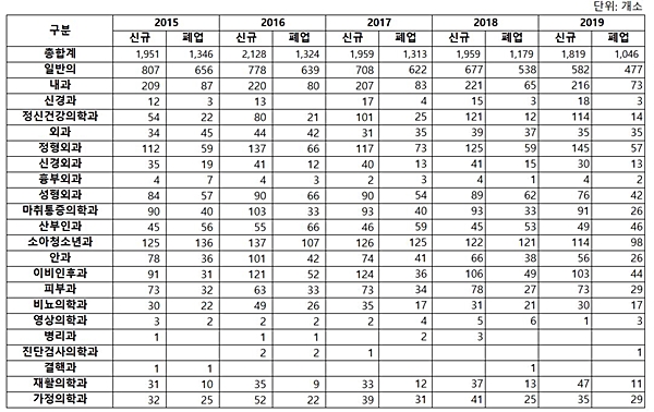 ¿Ü°úÀÇ °æ¿ì Àü³â¸» Áø·á ÁßÀÌ´ø 995°÷ÀÇ ¿Ü°ú ÀÇ¿ø Áß 35°÷ÀÌ ¹®À» ´Ý¾Æ 3.5%ÀÇ Æó¾÷·üÀ» ±â·ÏÇß´Ù. ´Ù¸¸ °°Àº ±â°£ »õ·Î ¹®À» ¿¬ ¿Ü°úÀÇ¿øµµ 35°÷À¸·Î µ¿¼ö¸¦ ±â·ÏÇß´Ù.