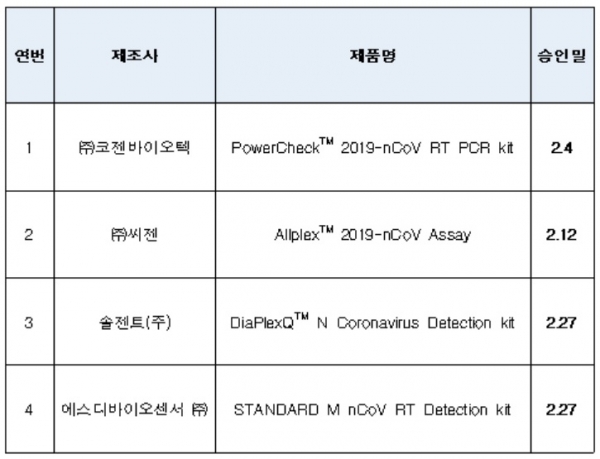 ÇöÀç, ±ä±Þ»ç¿ë ½ÂÀÎµÈ Äڷγª19 Áø´Ü½Ã¾à 4°³ Á¦Ç°Àº ¸ðµÎ ±¹³» ÀÇ·á±â±â Á¦Á¶¾÷ü¿¡¼ »ý»êµÇ¸ç, 3.9 ±âÁØ 1¸¸ 5971 kit(52¸¸ 2770¸í ºÐ·®)ÀÌ »ý»êµÅ ÀÌ Áß 1¸¸ 1478 kit(38¸¸ 1500¸í ºÐ·®)ÀÌ °ø±ÞµÇ¾ú°í 4493kit (14¸¸ 1270¸í ºÐ·®)Àº ÇØ´ç ¾÷ü¿¡¼ Àç°í·Î º¸À¯ ÁßÀÌ´Ù. 1 kit ´Â 25¸í ³»Áö 50¸í °Ë»ç ºÐ·®ÀÌ´Ù.