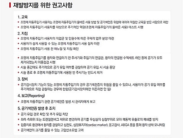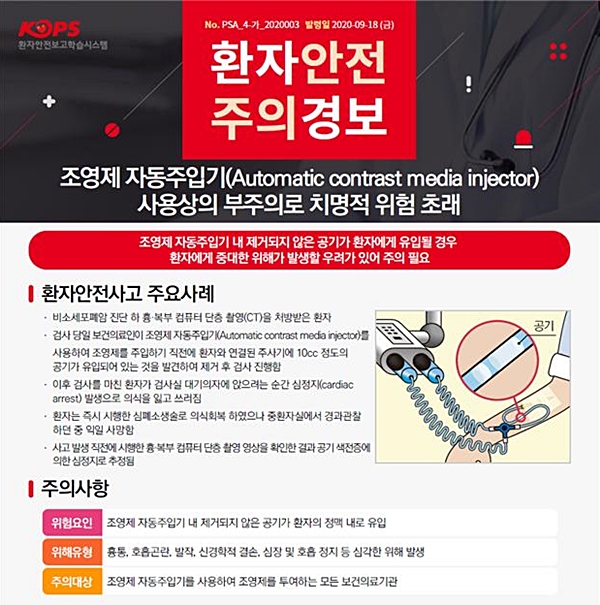 ÀÇ·á±â°üÆò°¡ÀÎÁõ¿øÀÌ Á¶¿µÁ¦ ÀÚµ¿ÁÖÀÔ±â(Automatic contrast media injector) »ç¿ë Áß Ç÷°ü ³»¿¡ °ø±â°¡ À¯ÀԵŠȯÀÚ°¡ »ç¸ÁÇÑ »ç·Ê¸¦ °ø°³Çϸç, ¿ä¾ç±â°üµé¿¡ »ç°Ç Àç¹ß¹æÁö¸¦ À§ÇÑ ÁÖÀǸ¦ ´çºÎÇß´Ù.
