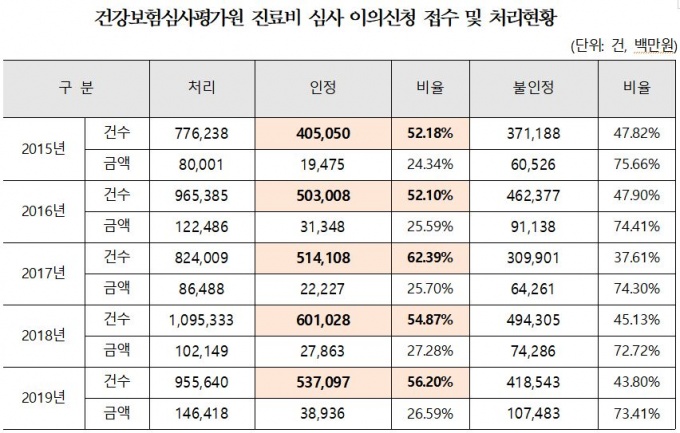 2015³â 77¸¸6238°ÇÀÌ´ø ÀÌÀǽÅû ó¸®°Ç Áß 40¸¸5050°Ç(52.18%)ÀÌ ÀÎÁ¤µÆÀ¸¸ç, 2019³â Àüü ÀÌÀǽÅû 95¸¸5640°Ç Áß 53¸¸7097°Ç(56.2%)ÀÌ ÀÎÁ¤µÅ 5³â°£ ÀÌÀǽÅû ÀÎÁ¤ ºñÀ²ÀÌ 4% °¡·® »ó½ÂÇß´Ù.
