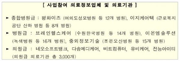 Á¤ºÎ°¡ ÀÇ·á±â°ü ÀüÀÚÀǹ«±â·Ï(EMR)À» ÅëÇÑ È¯ÀÚ ¾ÈÀü°ü¸® °³¼± ¹× ÀÇ·áÁ¤º¸ ±³·ù ±â¹Ý ¸¶·ÃÀ» À§ÇØ EMR ½Ã½ºÅÛ Ç¥ÁØÈ »ç¾÷À» ÃßÁøÇÑ´Ù. À̸¦ À§ÇØ Áß¿ÜÁ¤º¸±â¼ú°ú À¯ºñÄÉ¾î µî ÀÇ·áÁ¤º¸ °ü·Ã ¾÷ü 10°÷ÀÌ ÀÌ »ç¾÷¿¡ Âü¿©ÇÑ´Ù.
