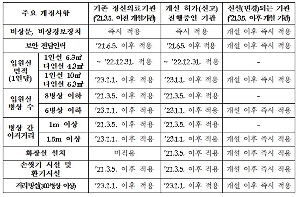 ÀÔ¿ø½Ç ´ç º´»ó ¼ö¸¦ ÃÖ´ë 10º´»ó¿¡¼ 6º´»ó ÀÌÇÏ·Î ÁÙÀ̰í, ÀÔ¿ø½Ç ¸éÀû ±âÁØÀ» ÇöÇà 1ÀÎ½Ç 6.3§³¿¡¼ 10§³·Î, ´ÙÀνÇÀº ȯÀÚ 1Àδç 4.3§³¿¡¼ 6.3§³·Î °ÈÇÑ´Ù. º´»ó°£ À̰ݰŸ®µµ 1.5m ÀÌ»ó µÎµµ·Ï Àǹ«ÈÇϱâ·Î Çß´Ù.