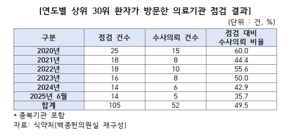 2020³âºÎÅÍ 2025³â 6¿ù±îÁö ¿¬µµº° ó¹æ »óÀ§ 30À§ ȯÀÚ°¡ ¹æ¹®ÇÑ ÀÇ·á±â°üÀ» Á¡°ËÇÑ °á°ú, ÃÑ 105°Ç(Áߺ¹ Æ÷ÇÔ) Áß 52°ÇÀÌ ¼ö»ç ÀǷڵƴÙ. Áߺ¹ ÀÇ·á±â°üÀ» Á¦¿ÜÇϸé Á¡°ËÇÑ º´¿øÀº 32°÷À̸ç, ÀÌ Áß 43.8%ÀÎ 14°÷ÀÌ ¼ö»çÀÇ·Ú Á¶Ä¡¸¦ ¹Þ¾Ò´Ù.