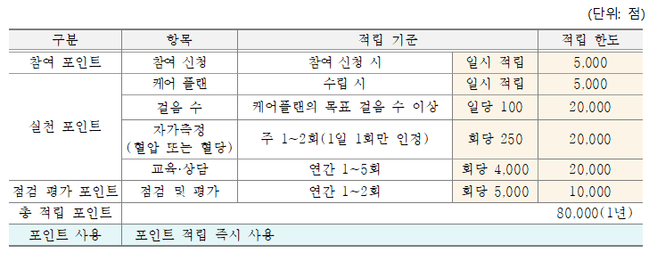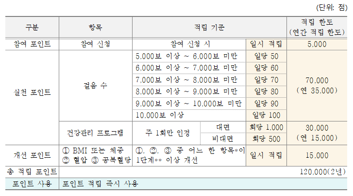 °Ç°»ýȰ½ÇõÁö¿ø±ÝÁ¦´Â Å©°Ô ‘¿¹¹æÇü’°ú ‘°ü¸®Çü’À¸·Î ³ª´¶´Ù. °È±â³ª ±³À° À̼ö µî °Ç°»ýȰÀ» ½ÇõÇÏ¸é Æ÷ÀÎÆ®°¡ Àû¸³µÇ´Â ¹æ½ÄÀÌ´Ù. 1Æ÷ÀÎÆ®´Â 1¿øÀ¸·Î ȯ»êµÇ¸ç, ¿¹¹æÇüÀº ¿¬°£ ÃÖ´ë 6¸¸ Á¡, °ü¸®ÇüÀº ÃÖ´ë 8¸¸ Á¡±îÁö Àû¸³ÇÒ ¼ö ÀÖ´Ù.