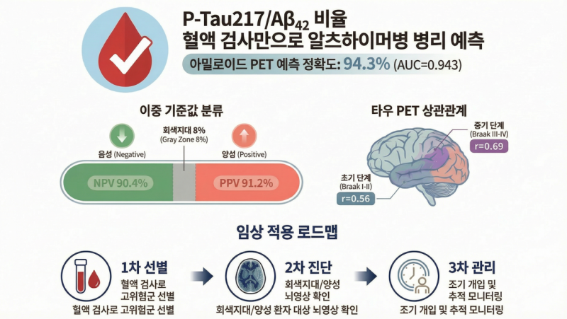 ¾ËÃ÷ÇÏÀ̸Ӻ´Àº ³ú ¼Ó¿¡ ¾Æ¹Ð·ÎÀÌµå º£Å¸ ´Ü¹éÁúÀÌ ½×À̰í Ÿ¿ì ´Ü¹éÁúÀÌ ¾ûŰ¸é¼ ³ú¼¼Æ÷°¡ ¼Õ»óµÇ¾î ¹ß»ýÇÑ´Ù. À̹ø ¿¬±¸¿¡¼ Ç÷¾× ¹ÙÀÌ¿À¸¶Ä¿(p-tau217/Aβ42) ºñÀ²Àº ¾Æ¹Ð·ÎÀÌµå º´¸®»Ó¸¸ ¾Æ´Ï¶ó ³ú Ÿ¿ì PET ¿µ»ó¿¡¼ È®ÀεǴ Ÿ¿ì ´Ü¹éÁú Ä§Âø Á¤µµ, ±×¸®°í MRI·Î ÃøÁ¤ÇÑ ¾ËÃ÷ÇÏÀ̸Ӽº ³ú À§Ãà ¼Ò°ß°úµµ °·ÂÇÑ »ó°ü°ü°è¸¦ º¸¿´´Ù.