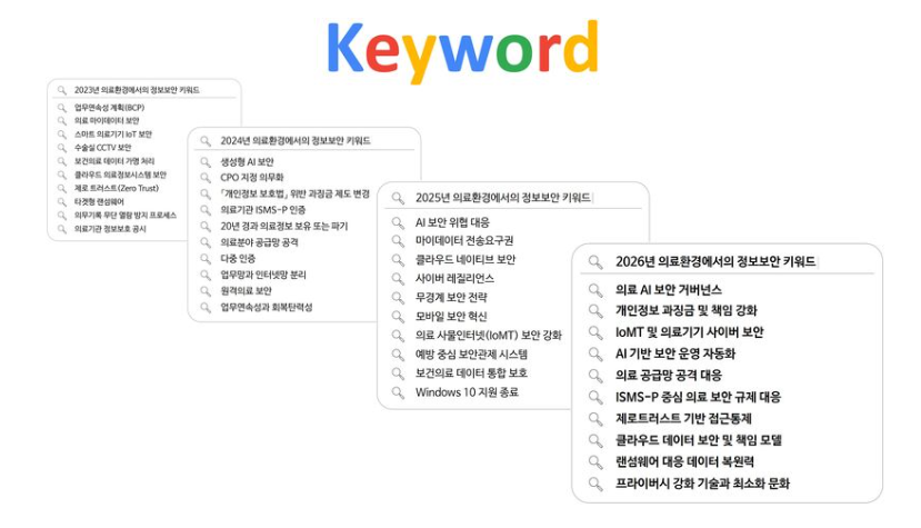 ÃÖ±Ù Åë½Å»ç¿Í À¯Åë»çÀÇ ´ë±Ô¸ð °³ÀÎÁ¤º¸ À¯Ãâ »ç°í°¡ ÀÕµû¸£¸ç µðÁöÅРȯ°æ Àü¹ÝÀÇ °³ÀÎÁ¤º¸ Ä§ÇØ À§ÇèÀÌ ºü¸£°Ô È®»êÇÏ´Â ¸ð½ÀÀÌ´Ù. ƯÈ÷ ¹Î°¨ÇÑ È¯ÀÚÁ¤º¸¸¦ ´Ù·ç´Â ÀÇ·á ºÐ¾ß´Â º¸¾ÈÀÇ Á߿伺ÀÌ ¹è°¡µÈ´Ù. ÃÖ±Ù¿¡´Â ÀÇ·á ÀΰøÁö´É(AI), Ŭ¶ó¿ìµå ÀÇ·áÁ¤º¸½Ã½ºÅÛ µî º¸´Ù ÁøÀϺ¸µÈ ½Ã½ºÅÛÀÌ ¼Ó¼Ó µµÀԵǰí, ±×¿¡ µû¸¥ °¢Á¾ Á¦µµ°¡ ½ÃÇàµÇ¸é¼ º´¿øµéÀº ³ô¾ÆÁø ÆíÀǼº ¸¸ÅÀ̳ª ½Å°æ ½á¾ß ÇÒ ¿ä¼Ò°¡ ´Ã¾î³µ´Ù. ÀÌ¿¡ º´¿ø°è º¸¾È ´ã´çÀÚµé·Î ±¸¼ºµÈ ´ëÇѺ´¿øÁ¤º¸º¸¾ÈÇùȸ(ȸÀå ¹ÚÁ¾È¯, »ï¼º¼¿ïº´¿ø CISO)´Â Áö³ÇØ¿¡ À̾î 2026³â¿¡µµ º´¿øµéÀÌ ÁÖ¸ñÇØ¾ß ÇÒ 10´ë Á¤º¸º¸¾È Ű¿öµå¸¦ ¼±Á¤, ¹ßÇ¥Çß´Ù. ÀÇ·áȯ°æ ÃֽŠº¸¾È À̽´¿Í Á¤Ã¥·±â¼ú º¯È¸¦ ¹Ý¿µÇØ ¼±Á¤µÈ Ű¿öµå´Â 2026³â ÀÇ·á±â°ü º¸¾È Á¤Ã¥ ¼ö¸³°ú ¿î¿µ ¹æÇâÀ» Á¦½ÃÇÏ´Â ÁÖ¿ä ±âÁØÀ¸·Î Ȱ¿ëµÉ °ÍÀ¸·Î ±â´ëµÈ´Ù.