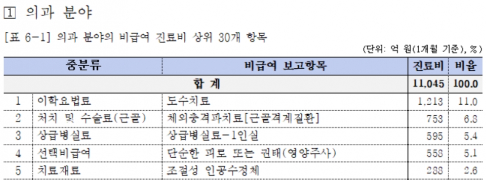 ºñ±Þ¿© º¸°í´ë»ó Áß '±Ù°ñ°Ý°èÅëÀÇ ÅëÁõ °¨¼Ò ¹× ±â´É ȸº¹ µî'ÀÇ ¸ñÀûÀ¸·Î »ç¿ëµÇ´Â ÁÖ¿ä Ç׸ñ(µµ¼öÄ¡·á, ü¿ÜÃæ°ÝÆÄÄ¡·á, Áõ½ÄÄ¡·á-»çÁö°üÀýºÎÀ§, Áõ½ÄÄ¡·á-ôÃߺÎÀ§, ½ÅÀåºÐ»çÄ¡·á)ÀÇ °æ¿ì Àǰú ºÐ¾ß Àüü Áø·áºñÀÇ ¾à 21.9%(2419¾ï ¿ø)¸¦ Â÷ÁöÇÏ´Â °ÍÀ¸·Î ºÐ¼®µÆ´Ù.
