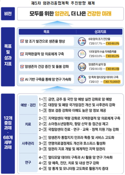 5Â÷ Á¾ÇÕ°èȹÀº ‘¸ðµÎ¸¦ À§ÇÑ ¾Ï°ü¸®, ´õ ³ªÀº °Ç°ÇÑ ¹Ì·¡’¸¦ ºñÀüÀ¸·Î ¡ã¾Ï Á¶±â ¹ß°ßÀ¸·Î »ýÁ¸À² Çâ»ó ¡ãÁö¿ª¿Ï°áÀû ¾Ï ÀÇ·áü°è ±¸Ãà ¡ã¾Ï»ýÁ¸ÀÚ °Ç° ÁõÁø ¹× µ¹º½ °È ¡ãAI ±â¹Ý ±¸ÃàÀ» ÅëÇØ ¾Ï ¿¬±¸ °¡¼Óȸ¦ ¸ñÇ¥·Î 4°³ ºÐ¾ß, 12°³ ÁßÁ¡°úÁ¦, 68°³ ¼¼ºÎ°úÁ¦·Î ±¸¼ºÇß´Ù