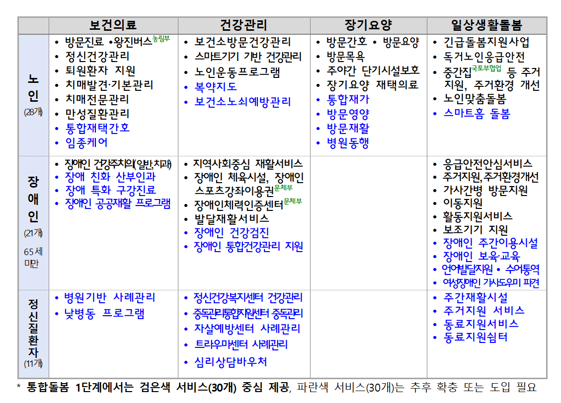 1´Ü°è¿¡´Â 4°³ ºÐ¾ß(º¸°ÇÀÇ·á, °Ç°°ü¸®, Àå±â¿ä¾ç, ÀÏ»ó»ýȰµ¹º½) 30Á¾ ¼ºñ½º¸¦ Áß½ÉÀ¸·Î ¿¬°èÇÑ´Ù.